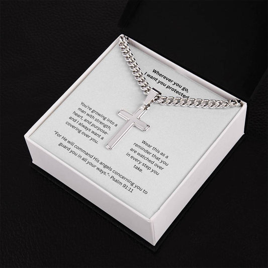 Engraved Gold Cross Pendant And Gold Cuban Link Chain